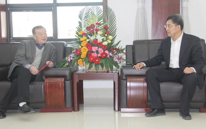 1月29日,沂源縣縣委書記王義樸(右前二)一行十余人來(lái)我公司看望省級(jí)勞動(dòng)模范、董事長(zhǎng)柴文...