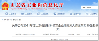 山東省工信廳2021年1月28日發(fā)布了《2021年度山東省新材料領(lǐng)軍企業(yè)培育庫入庫名單》和《2021年度山東省新材料領(lǐng)軍企業(yè)50強名單》。